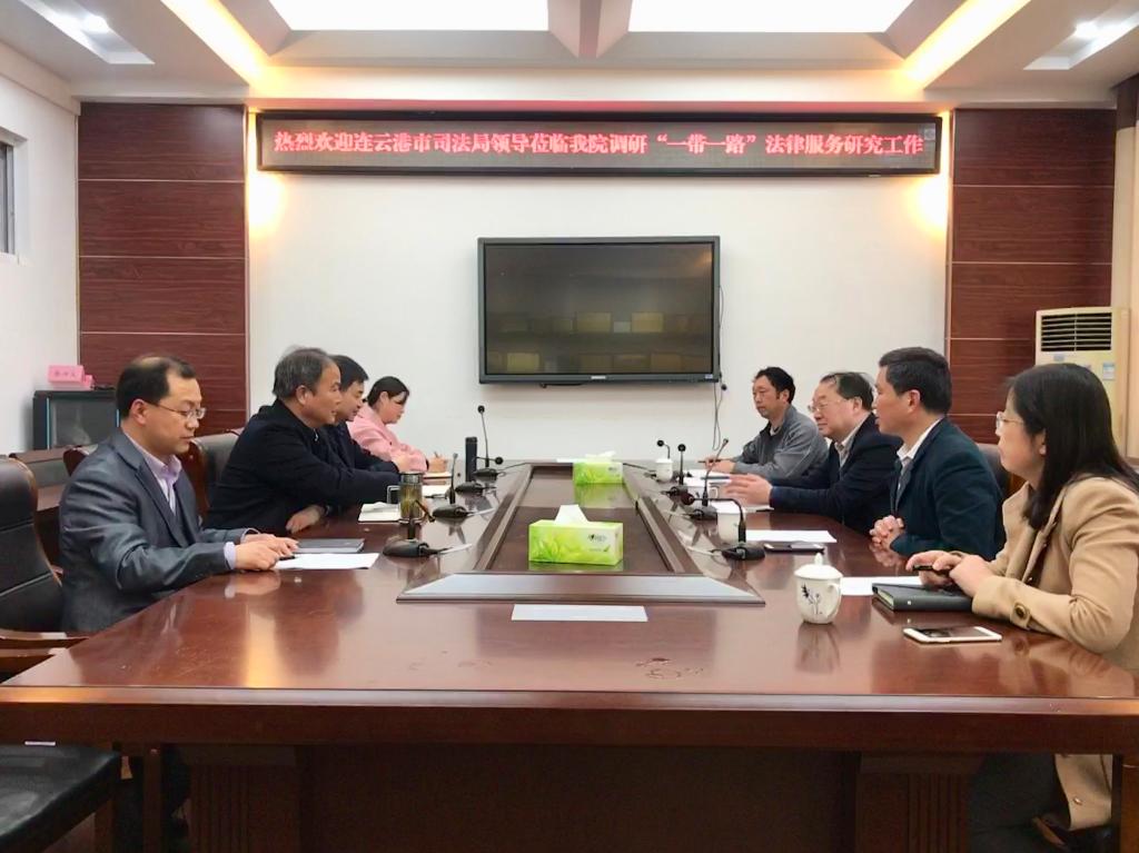 4月29日下午,连云港市司法局党委书记秦国臣一行来到我校调研“一带一路”法律服务研究工作,市司法局党委委员谢佃钦、律管处处长张玉银、副处长吴宁陪同调研。调研会在我校法律与公共管理学院会议室举行,法管学院党总支书记朱国良、院长陈兴发,法学系主任吕汇、研究中心办公室主任、研究员吴建国参加了调研会。