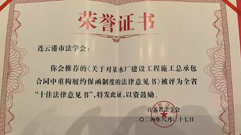2024年8月27日,江苏省法学会评选出十佳法律意见书,江苏省“一带一路”法律服务研究中心建工委主任董德华、连云港市委政法委法治处处长隋心、中心建工委委员汪世芳、刘贤磊共同撰写的《关于对某水厂建设工程施工总承包合同中重构履约保函制度的法律意见书》(以下简称《法律意见书》)榜上有名。