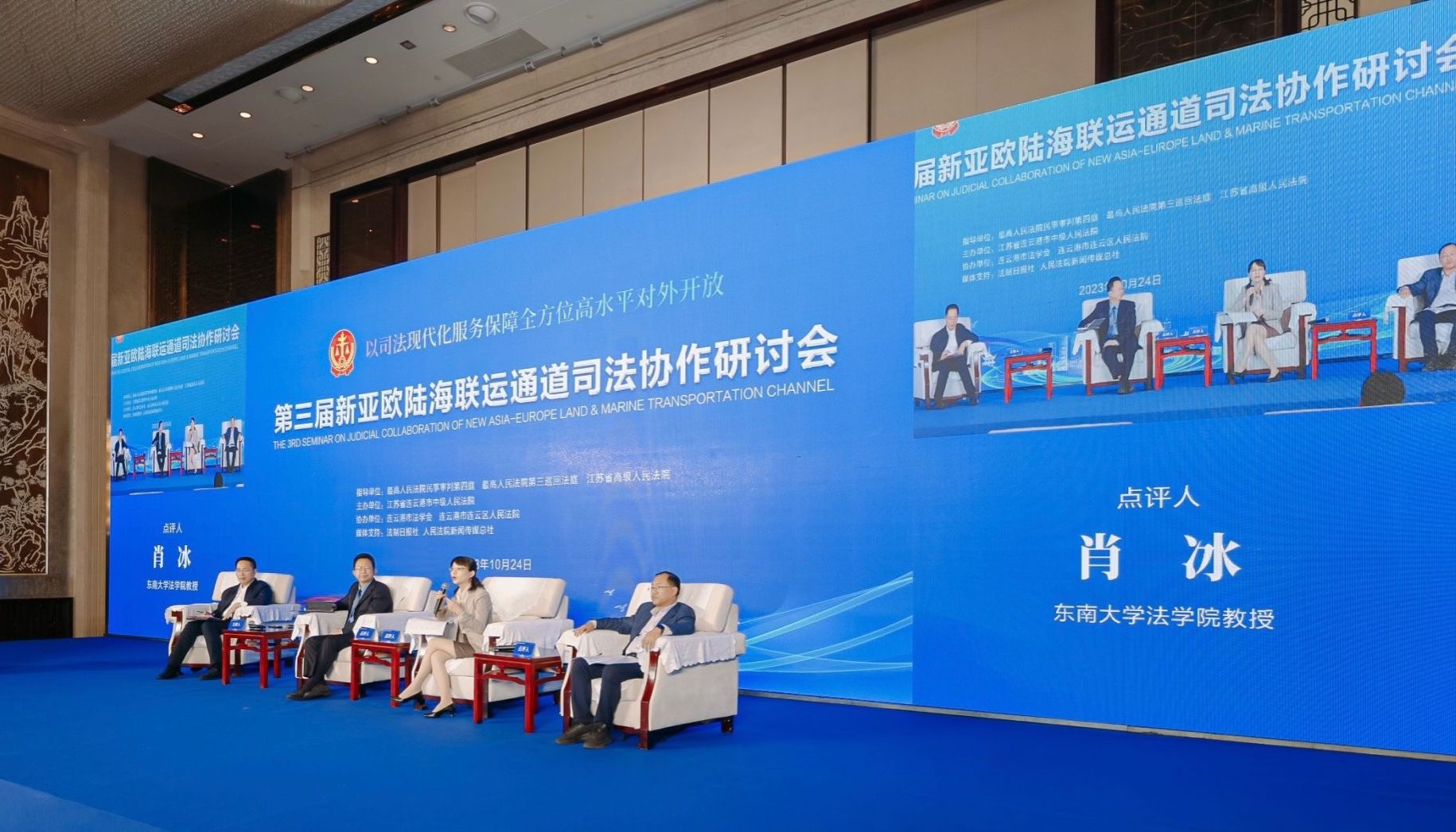 10月24日-25日,第三届新亚欧陆海联运通道司法协作研讨会在江苏省连云港市成功召开。此次会议正值共建“一带一路”倡议提出十周年和第三届“一带一路”国际合作高峰论坛刚刚闭幕之际,因而得到了各方的普遍关注。最高人民法院、江苏省高级人民法院、连云港市委、市政府等有关领导出席开幕式并致辞。开幕式由连云港市中级人民法院党组书记、院长李红建主持。“一带一路”沿线城市法院院长、涉外审判业务专家、高校和科研机构的专家学者参加了此次研讨会。江苏省“一带一路”法律服务研究中心执行主任、研究员赵科学、中心办主任、研究员吴建国应邀参加研讨会并做了点评发言。