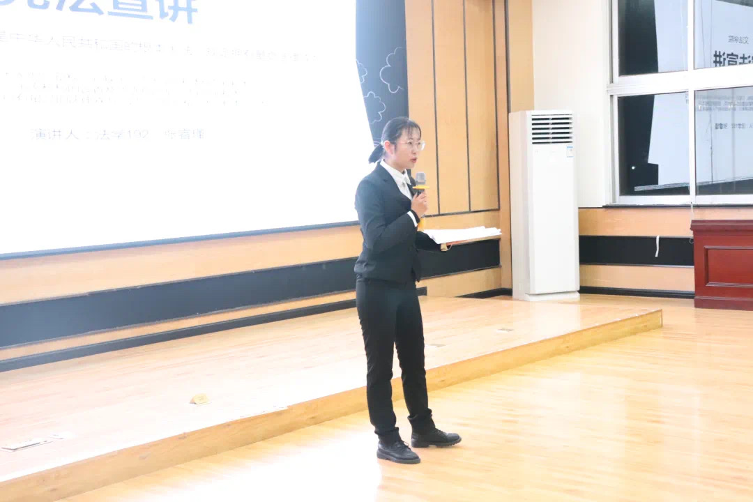 来自法学192班的张睿瑾同学主要阐述了宪法的重要性,作为我国根本大法的宪法对国家的意义所在。她倡议当代大学生应当从我做起,加强自己的宪法意识和水平,做到知法、懂法、守法、用法,她相信,法律面前,人人平等,世间所有的美好与我们环环相扣。