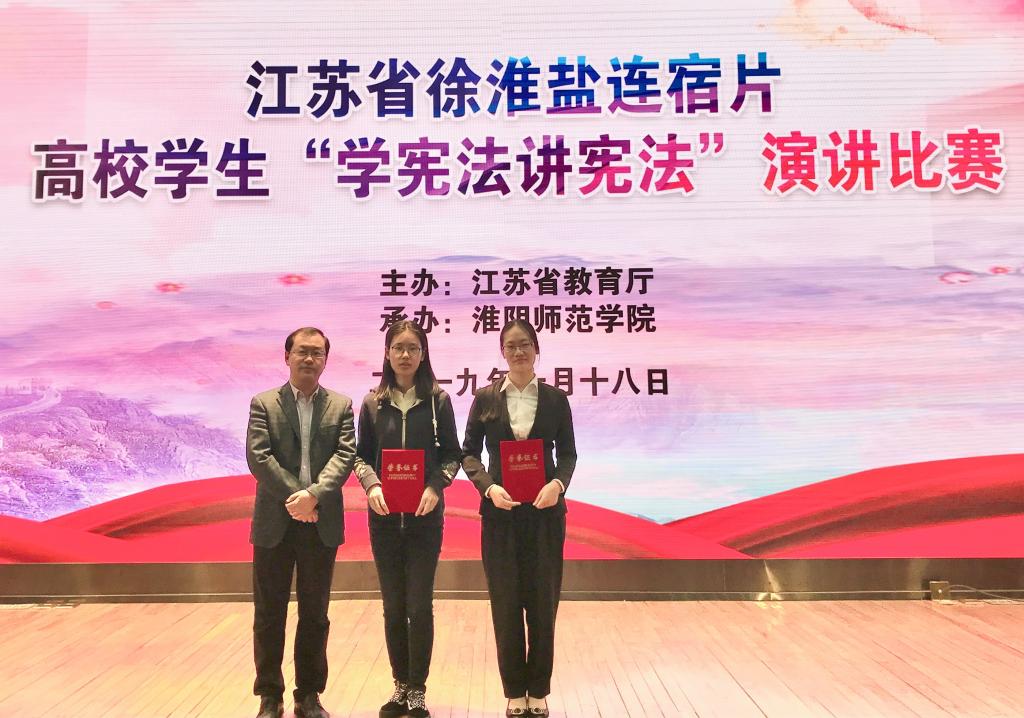 10月18日,江苏省徐淮盐连宿片高校学生法治知识竞赛和“学宪法讲宪法”演讲比赛在淮阴师范学院举行。此次比赛由江苏省教育厅主办,淮阴师范学院承办,主题为“尊崇宪法、学习宪法、遵守宪法、维护宪法、运用宪法”,比赛旨在深入贯彻落实习近平总书记关于宪法学习宣传教育的系列重要指示精神,进一步引导和促进广大青年学生深入学习宪法、尊崇宪法、弘扬宪法,推动宪法实施。中国矿业大学、江苏师范大学、徐州医科大学等苏北五市23所高校的46名选手参加了此次比赛。我院法学171班王嘉惠和江艳两位同学参加了比赛,吴建国副教授作为指导教师带队参赛。
